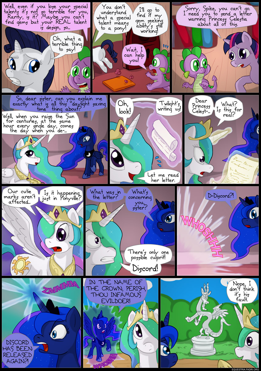 Elfangor It's a trick. That's not the real Discord. That's Loki impersonating Discord's statue. Or something. 2012-07-16 01:05:08 Nicolas Nonexist sooo , celestia and luna decided to put discord back in the royal garden ... BRILLIANT 2012-07-16 01:15:23 Steve "There's can be only a responsible!" Besides that, looking forward to the next comic. 2012-07-16 01:22:35 mariods Todos echándole la culpa siempre al pobre Discord, coñe, bastante tiene con lo suyo. :b 2012-07-16 01:23:34 Pink Champagne Making things disappear and reappear, sounds like prestidigitation. Perhaps a certain pony with amazing, showstopping ability is behind this. 2012-07-16 01:33:30 Fadri @Steve I changed it. :P I hope it sounds less derped now. XD 2012-07-16 01:37:09 Draug Don't you see, people? It's Fadri's evildoing! It'll be revealed soon, of course. 8D 2012-07-16 01:49:19 Willy Galleta Yay! More PONY! 8D 2012-07-16 02:23:03 *insert dinkleberg face* 2012-07-16 03:17:03 Minecat WOO! It's finally here! 2012-07-16 05:00:16 KK70014 I looked at every single last one of these....I loves them! /) Brohoof! 2012-07-16 05:06:19 Ravenmane It's just a cardboard cutout of the statue! 2012-07-16 05:55:27 Limey Lassen Yussss. I love it. Luna is seriously the best. 2012-07-16 07:09:40 DemonKaizoku I can't help but notice Rarity has a bit more of a pudgy flank in the second panel, than usual. XDD 2012-07-16 07:09:58 BigMac101 Why do i get the impression that it is Trixie's doing all of a sudden? 2012-07-16 11:24:21 Tom S. Foc “habilityâ€? Did you do some hypercorrection, there? 2012-07-16 12:44:56 Tom S. Fox Sorry, misspelled my name. 2012-07-16 12:45:19 (O )____( O) 2012-07-16 13:34:24 Boter Yay another update! I'm really liking this story based approach, makes good use of the webcomic format; one-offs work well on DeviantArt, and storylines work well on a dedicated site like this. Great stuff so far, I'm in suspense! (and fits of giggles!) 2012-07-16 13:59:42 Qin el Kirin ¡¡Feliz Aniversario de esta tira comica!!. Happy Aniversary for this comic Strip.!! 2012-07-16 19:55:24 MarkTheCat Ah, I'm loving your comics! This new series is a great change of pace, and can't wait for more! 2012-07-16 21:06:48 pm hm.... interdasting. This is getting better. 2012-07-17 01:27:10 swftkat For a second there I thought I saw a Sailor Moon reference XD Unless. :D That -was- it in Luna's own unique way. "IN THE NAME OF THE ME. I SHALL PUNISH YOU!" :strikes pose: 2012-07-17 02:52:54 Drakua *laughs oddly maniacally* Oh that's gotta suck. 2012-07-17 04:38:43 Benny Well, she's clearly out of ideas already. 2012-07-17 04:39:21 The Weak and Powerless Trixie *crying* M-m-my C-cutie Ma-mark!!! 2012-07-17 04:39:58 Alex Warlorn Discord's thoughts, "I am laughing my ass off at you inside." 2012-07-17 05:00:07 Pony Dictator NOPE. Chuck Testa. 2012-07-17 05:30:04 Woot! Seeing Luna getting hulked up to kick some flank was really neat. Nice Job! 2012-07-17 05:58:02 everypony And that's how ponyville turned into Sunny Town (Story of the Blanks). 2012-07-17 07:15:49 Blue Balls The Pony Liek meh on facebook? I will be posting pics like this, and other hilarious shtuff. I am Blue Balls The Pony. please? Trixie won't be on the show unless the deed is done? .... maybe? :3 2012-07-17 08:32:21 Evilbob0 @NIcolas. Indeed. You'd think after he got randomly released by a group of squabbling children last time, he'd have been moved to a more secure location. Wouldn't want him to be released everytime the Elements changed hoofs... 2012-07-17 18:30:57 Haidere678 Happy late anniversary! 2012-07-17 20:36:22 D. Shadows Oh sure blame the chaos being for chaos... that's what everyone does. 2012-07-17 23:09:25 Grollo I think I prefer the one-off strips, you're pretty good at those. This story thing isn't bad by itself, but it doesn't really work with your uploading speed - when the next strip is out, you've already forgotten the story. Otherwise, like your comic! 2012-07-18 02:36:10 Mr_S Congrats for this year full of ponies xD Luna, you are not the best one for accusing people of being infamous evildoers! 2012-07-18 19:02:39 Serpent Discord's statue looks like he's telling Luna "No no, hell no it wasn't me!" xD 2012-07-19 17:37:39 BlackWidower Wow, that's random. 2012-07-19 17:54:05 haktualisa lla weon 2012-07-19 20:41:55 My Name Isn't Funny Celestia's face in the last panel. 2012-07-20 02:20:55 LinkNinjaMaster Lol at last panel xD But oooOOOOOooohhh the expectation!!! I want to see what happens next!! :O 2012-07-20 05:19:15 Dexam I have no idea how, but the Cutie Mark Crusaders are somehow responsible for this. Just you watch - it'll all end in tree sap, pine needles, and fire! :P 2012-07-20 10:34:25 boomba Its crysalis! DUN DUN DUUN! 2012-07-22 07:41:52 HowlingStorm Celestia: Then if Discord didn't do it, then there is only one culprit resonsible for this! ... Luna: And? Celestia: I have no idea 2012-07-23 03:29:12 Minty Tech F*CK ALL YA'LL IM A DRUNCK MOTHERF*CKA B*TCH F*CK ALL YA"LL 2012-07-23 04:27:42 Alan S. What a waste of a perfectly good dramatic entrance. 2012-07-23 09:11:18 HowlingStorm Celestia: Then if Discord didn't do it, then there is only one culprit resonsible for this! ... Luna: And? Celestia: I have no idea 2012-07-23 16:50:34 HowlingStorm Celestia: Then if Discord didn't do it, then there is only one culprit resonsible for this! ... Luna: And? Celestia: I have no idea 2012-07-23 19:06:17 Storm Eclipsia Darn... I wanted Celestia and Luna to be affected so that they couldn't raise the sun and moon! 2012-07-24 22:40:26 Wtf... Wow! Your art really sucks...there is no talent. Get some talent bro or get off the freaking internet 2012-07-25 04:09:49 Fred I know who's really responsible: Red Herring! 2012-07-25 06:59:13 Karkat WELL, THAT ANSWERS NONE OF MY GODDAMN QUESTIONS. 2012-07-25 18:27:10 Veneziano_Vargas I can hear their voices when I read the bubbles. Is that bad? 2012-07-25 20:11:38 123lionclan ...MAKE ANOTHER COMIC!!! 2012-07-26 18:48:07 pawnaehs celest