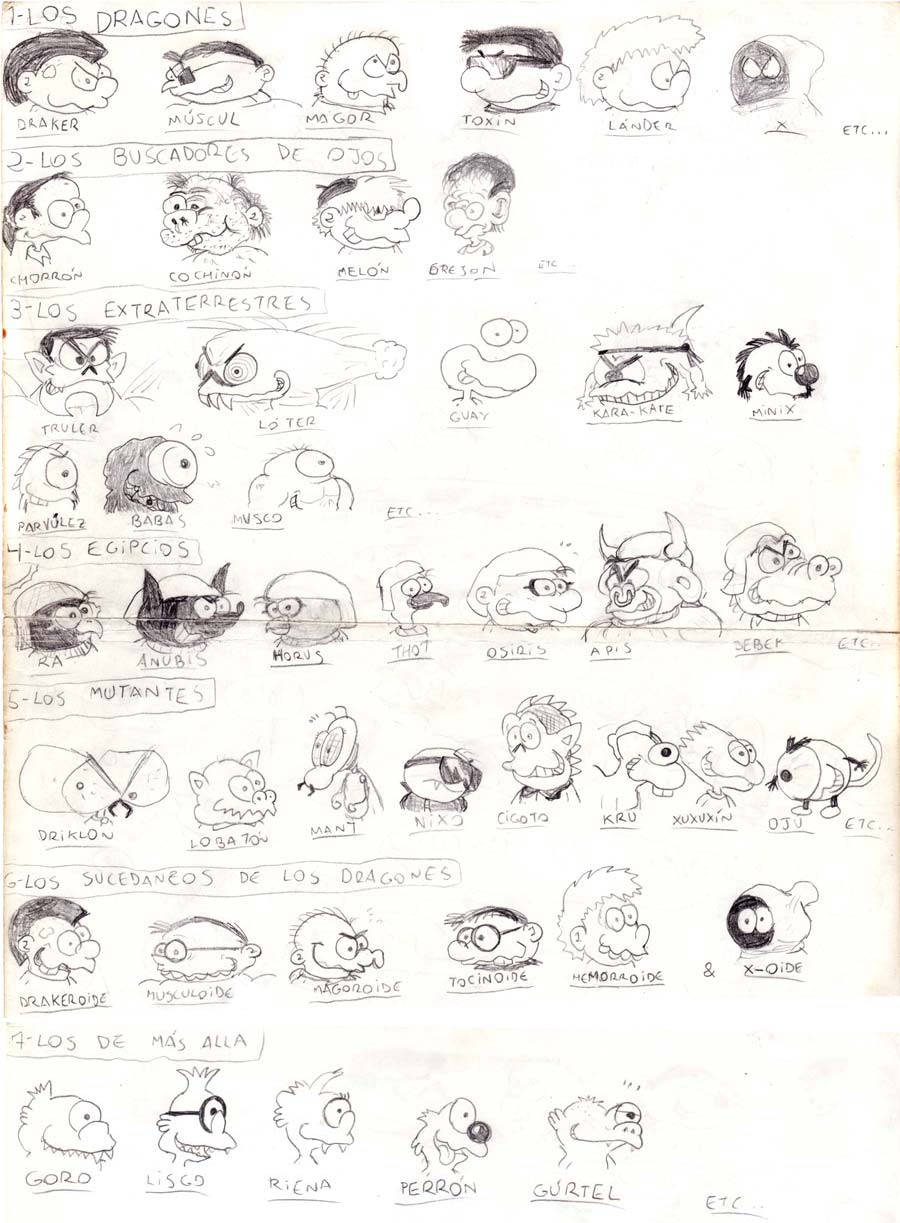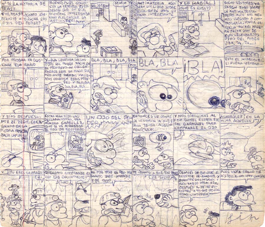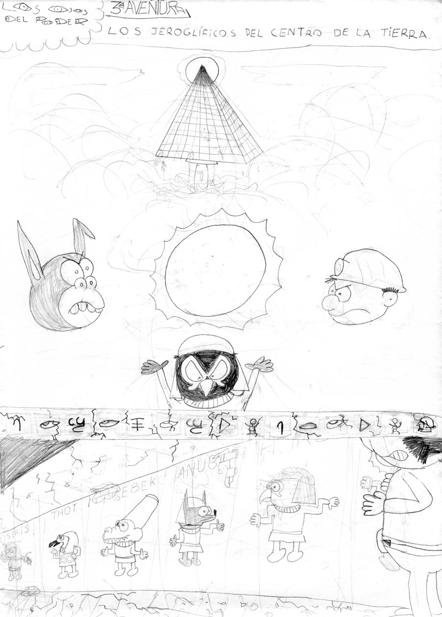 Los jeroglíficos del centro de la Tierra: 06 07 08 Ahora se las tendrían que ver con los mismísimos dioses egipcios encabezados por Ra, que iban a tener la gracia de que hablarían en su lengua natal con jeroglíficos, pero de los de pasatiempos, no los otros. También haría su aparición por el lado de los buenos Sadi, que fue mi primer personaje femenino, pero la pobre nunca se estrenó en cómic. Y también saldría Ludovico, el de cabeza de burro que sale en otros de mis cómics viejos. Y Miner... eh... que era un... minero... Con el poder de... ser minero...