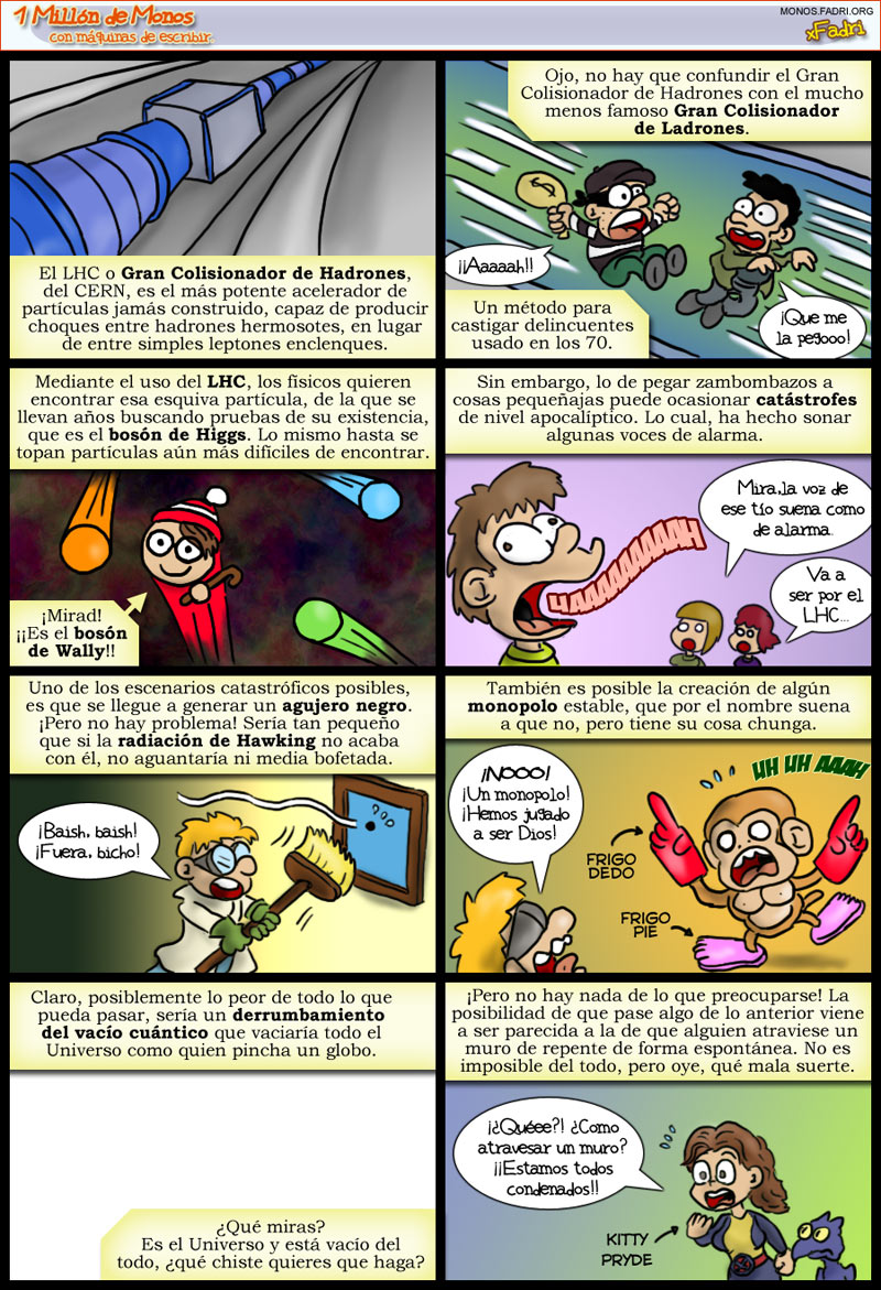 Hoy toca tira cientÃfica. En cuanto se publique esta tira - y según http://www.lhcountdown.com/ - quedarán 72 horas para la activación del LHC. ¿Habrá apocalipsis? Por supuesto que sÃ, varias señales nos lo anuncian: - Morán está en El Jueves como guionista de una sección veraniega suya que ha conseguido tras currárselo mucho. Todo el mundo ya lo sabe, todo el mundo ya lo ha contado, todo el mundo ya le ha felicitado. Pero es que está en El Jueves. Está de verdad. - Tras esta noticia, todo es como 200 veces menos señal del apocalipsis, pero también ha terminado Minus, uno de los webcómics en inglés que solÃa leer y que más me gustaba. Un webcómic sobre una niña casi omnipotente. Ahora lo podéis leer de un tirón. :P - ¡Oh, Diosa de la Pesadilla Eterna! Acaba de salir por fin una nueva temporada de Slayers. ¡¡Slayers!! ¡¡Reena y Gaudi!! ¡¡Chorrocientos años después de la última!! Ya está fansubeado por ahà y todo. xD Y eso. Hasta la próxima tira de 1MM, en algún Universo alternativo que sobreviva a la catástrofe. ^_^ 2008-07-05 00:00:47 Adnor Yo una vez atravesé una mesa, pero por la mitad... No veras que molesta después. 2008-07-05 00:07:18 Morán Es probablemente la mejor tira que he leÃdo en tiempo XD De lo que estoy seguro es de que es la mejor tira sobre hadrones que he leÃdo nunca. 2008-07-05 00:07:19 Elfangor baish baish xDDDD ¡monúsculo ha hecho un cameo en el cómic! xDDDD ¡Kitty! *_* estos fÃsicos hacen cosas bien raras... 2008-07-05 00:22:56 Willy Galleta THE END IS NEAR 2008-07-05 00:47:50 Defriki This is the way the world ends... 2008-07-05 01:47:08 Koopa Ana ha de pasarse por aquà y opinar. La tira, como dice Morán, es GENIAL, oh, si! 2008-07-05 02:01:25 Puma Save the monopolo, save the world 2008-07-05 02:26:15 Aoimaru ¡Un mono polo! Hmmmmmm -w- ¿De qué sabor será? OwO 2008-07-05 08:51:43 Morghost Juasss, la viñeta de hoy rezuma genialidad por todas las esquinas. Me encanta eso de los "hadrones hermosotes", te los imaginas como frambuesas enormes al lado de los enclenques leptones (es lo malo de la dieta báltica, que en Leptonia mucho arenque ahumado, pero de hierro y vitaminas más bien poco) 2008-07-05 10:50:14 Diablillo Oye, y la nueva temporada de Slayers donde la has visto? 2008-07-05 12:14:57 Fadri http://www.youtube.com/watch?v=X3P-2DLm-_s :P 2008-07-05 12:23:29 Ups Y ni me habÃa dado cuenta pero vamos a palmarrr! :O 2008-07-05 13:07:32 gOrDiNfLoW Me llevo 2 2008-07-05 13:20:36 Bartu No he entendido muy bien la tira pero dibujÃsticamente hablando está bien hecha. Y pienso tomarme en serio lo que dices del Apocalipsis: que haya entrado Morán antes que yo siendo el hermano de uno de los dibujantes del Jueves hace que pierda la fe en la humanidad. 2008-07-05 14:44:28 Druida Que bonita es la fÃsica de partÃculas XD 2008-07-05 15:59:47 John Wheel Es la tira cómica con la que más he aprendido en toda mi vida. 2008-07-05 16:23:08 picco el monopolo! el nuevo rival para el pirulo! no quiero saber por donde lanza agua el monopolo... 2008-07-05 19:40:17 Draug Si aparece un agujero negro de ésos pienso bautizarlo Graveesha. Y cuidarlo como un hijo. O como dos, no sé. xD Eso sÃ, ¡cuidado con el monopolo! xDDDDDDDD 2008-07-05 22:27:22 Diablillo De hecho creo que la posibilidad de que alguno de los casos anteriores suceda es casualmente exactamente igual a la probabilidad de que te toque 3 veces seguidas la loterÃa americana jugando los mismos números. 2008-07-06 00:10:21 Willy Galleta ¿Falta mucho? 2008-07-06 03:51:16 Dr. M.Ginius Lo del LHC me da bastante miedo...en serio...sera una broma,no? El apocalipsis sera de plutón,verdad?! 2008-07-06 04:27:12 DarkHorror Es verdad y falta poco Recuerden preguntar antes de subir, si el cohete va al sol! 2008-07-06 06:20:02 Diablillo Señores, una mala noticia. Si algo de lo anterior (el monopolo, el agujero negro, el derrumbamiento cuántico...) se da, no hay cohete que valga. Se va como mÃnimo el Sistema Solar al carajo. 2008-07-06 11:34:47 Dr. M.Ginius Eeeemh siento aguar la fiesta pero parece que el experimento esta muy controlado... 2008-07-06 11:57:44 Dr. M.Ginius De hecho creo que estas teorias apocalipticas son de los 4 cientificos locos resignados que no les dejaron entrar en el proyecto 2008-07-06 12:11:04 Dr. M.Ginius Ah! y Larvy no permitira que el universo colapse pk se lo quiere comer cuando este listo. En su defecto,Weegee sabe que si no hay mundo no puede dominar nada,asi que tambien lo impedira. 2008-07-06 12:34:01 Zelgadis1983 ¡¡¡Hay más señales que auguran el apocalipsis!! ¡¡España ha ganado la eurocopa!! Penitenciagite! Penitenciagite! 2008-07-06 14:03:40 Willy Galleta ¿Falta mucho? x2 2008-07-06 17:49:01 Dr. M.Ginius Que no hay apocolapsis leches,ademas,ya no hay ni pagina xDDD 2008-07-06 18:38:04 Dr. M.Ginius http://neofronteras.com/?p=1211 2008-07-06 18:43:15 Dr. M.Ginius Vivireis para ver la nueva temporada de Slayers,y tambien para ver Warhammer Online,Diablo III y otras tantas eurocopas ganadas... Espero que no os desanime. 2008-07-06 18:44:00 Fadri Pues yo sigo pegándome golpes contra la pared, a ver si la atravieso cuánticamente. :P 2008-07-06 20:48:16 Willy Galleta ¿Falta mucho? x3 2008-07-06 21:03:49 404, webcomic de humor que altera la física a su antojo » Archivo » 404: Damos soporte al LHC [...] de la tira de Fadri respecto al Gran Colisionador de Hadrones, y sin tomar en consideración las recomendaciones de mi [...] 2008-07-06 21:12:27 Dr. M.Ginius Willy faltan 2 horas y media 2008-07-06 22:19:22 Willy Galleta Sé lo que falta, tengo la cuenta atrás abierta en una pestaña desde hace más de un mes. XDD ¿Falta mucho? x4 :P 2008-07-06 22:24:06 Fadri ¿Qué pasa? ¡Han retrasado un mes el contador! O___O 2008-07-06 23:34:52 asdf FAKE FAKE FAKE FAKE 2008-07-06 23:45:32 Willy Galleta Nada, que el que maneja el blog es un manta y se ha cargado el contador al poner noticias nuevas, pero la hora de encendido sigue siendo las 24