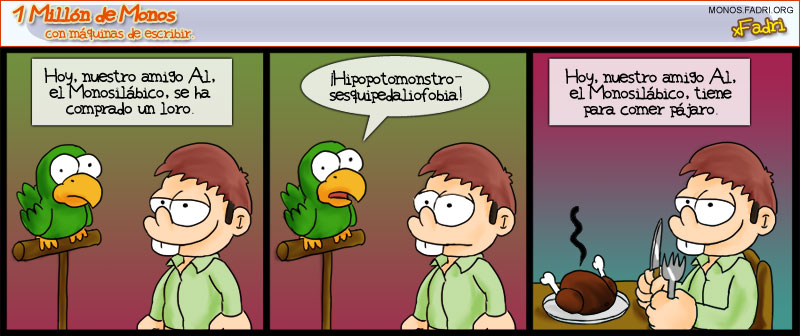 Yo bien, ¿y tú? 2008-07-16 00:03:38 Elfangor la de ideas que da el foro, ¿no? xDDDD 2008-07-16 00:08:52 Koopa Eso es del foro del WEE! LOL! 2008-07-16 00:09:54 Willy Galleta Menos mal que el loro no tiene afasia de conducción. XD 2008-07-16 00:10:40 gOrDiNfLoW No lo pillo, soy un rancio que ya no se mete en el foro del WEE, soy antisocial, huelo a jabalÃy quiero ser el nuevo troll de 1MM. Por lo demás todo mola. 2008-07-16 00:19:44 Fadri Pero si el chiste no tiene nada que ver con el foro WEE, menos que dicen la palabreja de hipopotomonstrosesquiopedaliofobia, que además en el foro la dije yo. O__o 2008-07-16 00:23:10 Draug La gente, ¡ea, lo relaciona todo con el WEE! Ya nos gustarÃa que el WEE fuese el centro del Multiverso, pero no va a ser... al menos hasta que el mundo se acabe dentro de poco menos de un mes y nos señalen diciendo "¡oh, llevabais razón!"... o algo asÃ... o al menos quiero imaginármelo asÃ. Además, ¡vuelve Al! ¡Al y el detective con Asperger molan! xD 2008-07-16 01:01:48 Mr Rothstein Uno de los personajes más carismáticos vuelve a por 1MM, lo que nos indica que los monos son mucho más inteligentes de lo que parece 2008-07-16 02:02:02 Dr. M.Ginius Que susceptible es Al! Bueno,yo tambien lo serÃa... 2008-07-16 03:58:51 OCL Este Al tiene un caso grave de MULTIPOLISILABOFOBIA. 2008-07-16 05:50:04 Areku xDDDDDD, muy buena, creà que no se volverÃa a ver a Al por acá xDDD, aunque era una idea muy buena como para usarla en 1 solo comic xDDD muy buena tira xDDDD, muy buena Salu2 and be happy 2008-07-16 06:03:16 Aoimaru LoL XD ¡AL HA VUELTO! OwO 2008-07-16 08:42:48 Meiling ea, y que nadie le vuelva a bacilar XD 2008-07-16 11:10:07 ELSEwok ¡Grandiosa palabra! Recuerdo que salió en un programa de 50 x 15.....en ese momento la aprendà y la propagué por el instituto.....a dos personas. 2008-07-16 11:28:36 John Wheel Asà aprenderá ese maldito loro a no presumir de capacidades verbales. 2008-07-16 11:29:17 Andore todos queremos un Al en nuestras vidas 2008-07-16 11:38:58 Crow En realidad el nombre completo de Al es Lucrecio Borgio Marco Ausebio Petro Segismundo Pablo Aldio Rigoberto Segundo 2008-07-16 11:56:30 1BillonDeMonas jajajjaja, los que se inventaron los nombre para las fobias eran un poquito cabrones xD 2008-07-16 11:58:55 Jimmy ¡Que bueno! Hipopotomonstrosequispedaliofobia... xDD ¡Esa palabra es peor que "otorrinolaringólogo"! 2008-07-16 14:04:20 ELSEwok Lo patético es decirle a uno que tiene esa fobia que la padece....utilizando la palabra "hipopotomonstrosesquipedaliofobia".....XDD -Doctor, ¿qué tengo? -Hipopotomonstrosesquipedaliofobia. -AAAAAAAAAAHHH!!! xD 2008-07-16 15:33:44 Luckyo87 Pero existe esa palabra? xD mu weno tio! 2008-07-16 16:17:57 meganium dios que bueno XD PD:fadri nimphs para cuando ? y quiero respuestas claras o escribire CHORROCIENTOS en numeros 2008-07-16 16:49:03 meganium PDD: la palabra en cuestion existe http://es.wikipedia.org/wiki/Hipopotomonstrosesquipedaliofobia 2008-07-16 16:52:51 ziRta Fad, es que nos hace ilu inspirar a tus monos :D Aunque sea un poquito... ELSEwork lo ha dicho >___< El que se inventó ese término es más cruel que un spoiler! 2008-07-16 18:38:03 pilar meganium, no serás capaz de meter chorrocientos número de nuevo... piensa que el chorrociento es un número que a Al le molesta XD Al intentó aprender alemán... Al desistió en el intento cuando vió la longitud de las palabras... 2008-07-17 14:22:24 Triky bueno, se que esto lo subiste hace un huevo, pero estoy leyendmelos desde el principio... y quiero decirte que esa fobia mola, pero me mola mas la araquibutirofobia, no es tan larga, pero es una de las fobias mas absurdas del mundo, si cabe, miedo a morir asfixiado porque se te pegue la matequilla de cacahuete en el paladar.... :) 2008-10-16 02:17:56 Alkanzord Coñe, el loro del Indiana Jones in the Fate of Atlantis... xD 2009-03-10 15:57:48 lorena k imagen mas graciosa jejeje el loro lo mejor!!! jejejej 2009-11-29 22:52:37 lola que dientes mas grandes tiene el muxaxete jejeje y el loro k boniko jajajja saludos para todos 2009-11-29 23:03:13 Otuplut. ¡Prime! 2011-04-06 04:01:31 vanee :) jajaja...bueena! 2012-10-29 00:10:43 eslomaximo que pade son unos tontontos y unos torpes 2013-01-19 21:35:33 :p oigan los comentarioque pongo sonmas torpes que una papa 2013-01-19 21:43:03 |