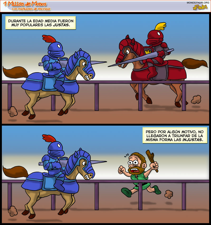 Tralará... 2008-08-02 01:28:12 Willy Galleta XDDDDD Mucho más tarde sà que llegaron a triunfar, pero no con las mismas armas. XD 2008-08-02 01:32:21 Mr Rothstein Jooo. A mi me gustarÃa una injuta ¡Monos vs Elefantes! 2008-08-02 01:32:59 Koopa Faltan ARMAS PESADAS. He dicho 2008-08-02 01:38:44 Willy Galleta Claro ejemplo: Snake vs Vulcan Raven. XD 2008-08-02 02:26:04 Dr.M.Ginius Lo mas curioso es que los dos caballeros parecen copiados y pegados cambiados de color,pero NO lo son! 2008-08-02 09:21:00 Crow joe XD es tan malo q me da la risa 2008-08-02 12:52:41 gOrDiNFLoW jajaja 2008-08-02 13:03:24 Anamarek Jajajajaja Ayer me dió más risa XD 2008-08-02 14:38:28 pilar jajajaja, buenÃsimo... aunque falso. Las injustas triunfaron pero pronto se quedaron sin voluntarios para salir con el garrote asà que fueron relegadas al olvido... 2008-08-02 14:51:28 John Wheel Que raro que no triunfaran, con lo que le gustaba a la gente los partidos de Leones Vs Cristianos. 2008-08-02 17:15:33 Elfangor mmm... de hecho, el primero ya es injusto. Es un zurdo contra un diestro, el diestro tiene una desventaja considerable por tener la lanza al otro lado xDDDD vaaaaaale, no he dicho nada. En serio, el cómic tiene gracia, pero no podÃa evitar ser puntilloso xDDDD We will rock you! xDDD 2008-08-02 18:20:28 Dr.M.Ginius Si te fijas el otro esta poniendo la lanza detras de la cabeza del caballo pa que esten al mismo lado 2008-08-02 20:54:27 Draug Tengo la apisonadora aquà al ladito para tirártela en la cabeza, Fadri. Pero como me ha hecho gracia el dibujo de la injusta, te lo perdono. xD 2008-08-03 13:08:54 Morán XDDDDDDD 2008-08-03 19:11:08 Zelgadis1983 JAJAAJA Yo apuesto por el hombre del palo... XD 2008-08-06 09:22:14 prret Una cagarruta... 2008-08-11 02:49:34 Gaspineitor ajjajajajajajajajajajaj tu humor me mata xD ajajajajajajajajajaj! Principalmente por la forma de tus caricaturas xD!! 2008-10-06 03:04:15 Danieke ooooohhhhhhh tenia que comentar esto XDXDXDXDXDXDXDXD 2010-08-26 04:45:50 dushdush Es el cómic más malo que ha existido jamás, yo ni siquiera lo llamarÃa comic, lo llamaria bodrio 2010-12-15 11:13:38 Aura-Lee ¡Qué vocabulario taan extenso, pie pocho! ¡Llamar cocido a un cómic! ¡Wow! http://buscon.rae.es/draeI/SrvltConsulta?TIPO_BUS=3&LEMA=bodrio 2010-12-17 19:47:30 |