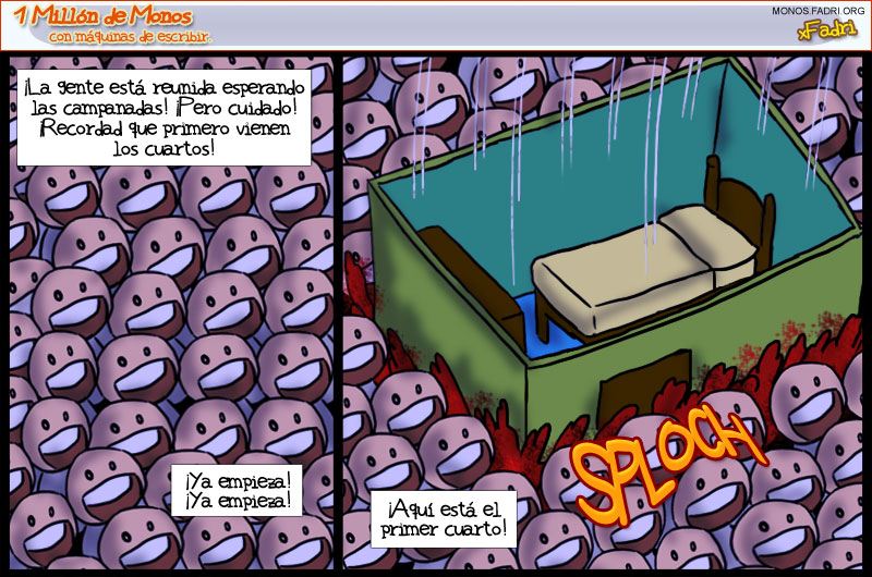 ¿No echábais de menos los juegos de palabras estúpidos? :P 2008-12-31 14:03:07 fozito Por supuesto que sà Fadri Por supuesto que sÃ. Feliz año!! 2008-12-31 14:12:58 Anamarek Jajajaja La multitud está expectante!! 2008-12-31 14:17:09 Draug ¿Y qué pasará cuando lleguen las campanadas? xD Se echaban de menos, Fadri. Asà Koopa irá aprendiendo cómo hacer juegos de palabras ingeniosos y absurdos, aunque ahora Koopa, por alguna razón, mola más... ¿Será la tableta? xD 2008-12-31 14:20:57 Hock xDD Me encantan. Feliz año. 2008-12-31 14:34:51 Andore Claro ke lo hechabamos de menos xD 2008-12-31 14:44:27 Comiquero91 Que cabrón xD Una tira genial 2008-12-31 14:54:04 Listo Entertainment ¡Feliz año! 2008-12-31 15:46:19 meneame.net No olvidéis que primero vienen los cuartos [humor]... ¡Ya está todo el mundo esperando las campanadas! Pero cuidado...... 2008-12-31 15:49:24 Feldkhon Tee-hee. Sà se echaban de menos, sÃ. 2008-12-31 16:12:23 Dennis el Azul Pues sà que los echábamos de menos, ya que Koopa no está actualizando mucho. ¡FELIZ AÑO NUEVO A TODOS LOS WEE! 2008-12-31 16:13:07 Ali Dios Santo... Es terrible xDDDD 2008-12-31 16:26:09 picco alguien se ha tomado las copas demasiado pronto 2008-12-31 16:48:49 Willy Galleta ¡Sploch! =D 2008-12-31 16:56:42 blip los clones tienen un poco cabeza de uva... feliz año, fadri! 2008-12-31 17:43:18 Elfangor Madre mÃa, ¿y los dibujaste todos en serio? con lo fácil que habrÃa sido usar copy+paste xDDDD (alguno veo con mucha pinta de copy+paste, todo sea dicho) 2008-12-31 17:59:15 John Wheel Dios, por favor, guÃa con tu benévola mano uno de los cuartos para que caiga encima de Ramón GarcÃa. Prometo mandar galletitas de dinosaurio para el niño Jesús, que se que le gustan. 2008-12-31 18:28:35 Fadri Halaaaaaa, ha llegado a portada de Menéame. xD 2008-12-31 18:56:19 Zelgadis1983 JAAJJAJAJAAJA Y están supercontentos sabiendo que lo más seguro que les toque a ellos después XDDDDDD Pd: Es que es para que esté en portada dónde sea... XDDDD 2008-12-31 19:09:55 hebep ere un crack xD Feli 2009! 2008-12-31 19:40:48 Blocker Dios!!! Completamente inesperado. Has conseguido que me rÃa a mandÃbula batiente. Gran chiste. 2008-12-31 20:48:30 johnny32 joder tio, con solo 2 viñetas me has alegrado esta mierda de dia jajaja ¡feliz año! 2008-12-31 20:49:25 johnny32 Además, sabes que muchos vamos a estar comiendonos las uvas y riendo a la vez por culpa de tu tira... Cuando leas en los periódicos que ha habido un atragantamiento general, no te sientas aludido...XD 2008-12-31 20:52:48 ludiko.com No olvidéis que primero vienen los cuartos [humor]... Vota este post en ludiko.com... 2008-12-31 23:04:12 Laurielle Total y absolutamente sin palabras. Bueno, sólo una. ¡Sploch! 2008-12-31 23:30:23 Kigub Feliz año 2009 (ojalá hubiera leido esta tira antes de las campanadas) 2009-01-01 13:04:16 ELSEwok Yeah, se echaban de menos =D 2009-01-01 14:15:54 MidouCloud Viva el humor absurdo XD! Vi la tira en meneame después por casualidad ¿Ya sufriste el efecto Fadri? XD 2009-01-01 17:58:58 Linkitsu! » Blog de enlaces curiosos y divertidos » campanadas literales [...] vino el primer cuarto en las campanadas. [...] 2009-01-01 19:12:04 FJ Je, je. Me recuerda a los conejitos suicidas, por lo que dice Zel. ¡Se les ve tan felices! XD 2009-01-01 21:58:46 Sceptil Grandioso, en serio xDDDDDDDDDDDDDDDDDDDDDDDDDDDDDDDDDDDDDDDDDDDDD 2009-01-01 22:57:04 konato juajjajaajajajajaja genial 2009-01-02 00:21:31 SmellWing Oo 2009-01-02 00:47:30 tal zas¡¡¡ xDD que malo¡¡¡¡¡¡¡¡¡¡¡¡ 2009-01-02 10:34:38 Seldon2 Siiiiii, echaba muchÃsimo de menos un juego de palabras estúpido. 2009-01-03 15:55:18 Manolito MrBlogger ey! no soy el único que piensa que los cuartos son eso! 2009-01-11 13:53:55 Humor gráfico sobre el cambio de año | Un hombre solo en la Red [...] (Visto en 1 Millón de Monos) [...] 2009-03-25 13:32:36 Gaspitron aajajjajajajajajajajajajajaj xD Que manera de reirme xD ajajajajajajjaaj!!! ¡¡¡Me encantan tus juegos de palabras!!! 2009-04-22 20:28:49 |