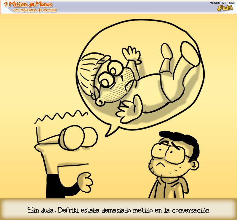 Ñabas. DecÃa el otro dÃa que los de ControlZeta estábamos preparando cosas, e iba en serio. De momento, estamos colaborando en una sección de webcómics para la revista digital dosdoce.com. Esta es la primera tira con la que he colaborado yo, y también llevamos puestos ya un estupendo artÃculo sobre webcómics escrito por Monroe y una tira de Laian. :P 2009-02-07 01:00:11 Koopa Defriki es un dibujante burbujaaa! 2009-02-07 01:03:21 Defriki Lo mejor de todo es que está basado en hechos reales. 2009-02-07 01:07:11 Draug Lo malo no es estar metido en una conversación DE Koopa... Peor es estar metido metido en una conversación CON Koopa. xD 2009-02-07 01:16:19 Vimes Sabes que tu adicción a los webcómics es preocupante cuando reconoces a webcomiqueros dibujados por otros webcomiqueros. Que con Fadri puede pasar más o menos, pero yo reconocà a Morán en una tira de Koopa... 2009-02-07 01:29:30 Willy Galleta ¡Un bocadillo de DeFrki! 8D ¡Ugh! >_< 2009-02-07 01:57:23 Elfangor Eso es que Koopa está enamorado de Defriki y sólo habla de él :-P 2009-02-07 03:21:17 ELSEwok Y yo que creÃa que era otro de los hadrones... 2009-02-07 12:41:04 John Wheel Una forma muy interesante de invocar personas ¿Funciona también con las modelos? 2009-02-07 13:54:12 Zelgadis1983 XDDDDD No me quiero ni imaginar el tamaño del bocadillo en una multi... XDDDD 2009-02-07 13:57:48 geoorg la cara de Fadri es buenÃsima :D 2009-02-07 14:55:17 Clapp! "Webcómic creado por Fadri, autor de Dragon Mail e integrante del colectivo Control Zeta Cómics." Que pretencioso, un "colectivo". :P 2009-02-07 16:41:46 Darkjoul 1MM, destrozando frases hechas desde abril de 2008... :D 2009-02-07 18:00:39 Ozanúnest Def no parece muy feliz... ¿Hacemos explotar la burbuja? 2009-02-07 21:48:01 Semana webcomiquera #3 « El muro de Charlie Draug [...] Un millón de monos: 084 “Conversación”. O cómo los juegos de palabras e imágenes de Fadri merecen tantas o más collejas que los de Koopa. xD [...] 2009-02-09 00:32:55 kirthar Nuestro Gran Koopa is Gran! 2009-02-09 00:58:58 Repelux Al menos no es "Defriki estaba en boca de todos". 2009-02-10 22:44:18 |