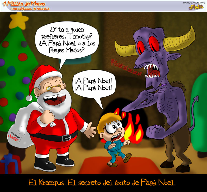 Encon buuuuu, yo lo conocia antes de que fuera popular y tuviera enlace a Wikipedia. Y Reservoir Racoons es mejor! 2010-12-24 16:04:52 clark2g ¡¡Feliz navidad a ti también, maciza!! 2010-12-24 16:05:00 OSuKaRu^-^ El chantaje. Grán arma. 2010-12-24 16:05:57 ELSEwok Tan instructivo como siempre xDD Por cierto: "se encarga de castigar a los niños malos en las vÃsperas a Navidad, y meterlos en su saco. Les enseña que el mal siempre se inclina ante el bien." WHAT. 2010-12-24 16:31:41 nolas Felices Cosas! 2010-12-24 16:42:40 j9 bueno al menos en mexico celebramos a los 2; doble regalo en estas visperas XD y lo del krampus ... que raro que nunca me hubiese visitado 2010-12-24 16:56:36 zelgadis1983 Muchas felicidades Fad!! :) 2010-12-24 23:24:43 Rydal No ven que la bolsa de Santa dice "Sponsored by Coca Cola"? Da igual, es una gran viñeta 2010-12-25 01:00:57 Eff ajkakjakjaj muy buena, bueno salud por una feliz navidad y un santaclaus rojo 2010-12-25 02:06:35 Anodino Es sublime! Feliz Navidad! 2010-12-25 08:46:58 Sr. z Oh, yo quiero uno!! :3 Mmm... Monúsculo se a agarrado de la "u" e su nombre :D 2010-12-25 17:30:49 equisd xD 2010-12-25 21:53:29 Marcos Ja ja ja aj ja, qué gran verdad 2010-12-26 21:10:00 Wiso1/2friki Ya decia yo que ese maldito gordo era diabolico XD 2010-12-27 19:35:36 the J.O. feliz navidad al maestro fadri, pero que no vuelva a usar la marca de coca-cola, o lo demandaran (otra vez)XD y feliz navidad a todos 2010-12-28 01:42:14 Vimes Moderando cuantarazon.com me he encontrado un cartel con tu chiste sobre el racismo de uvas. Eres popular o.O 2010-12-29 01:30:15 |