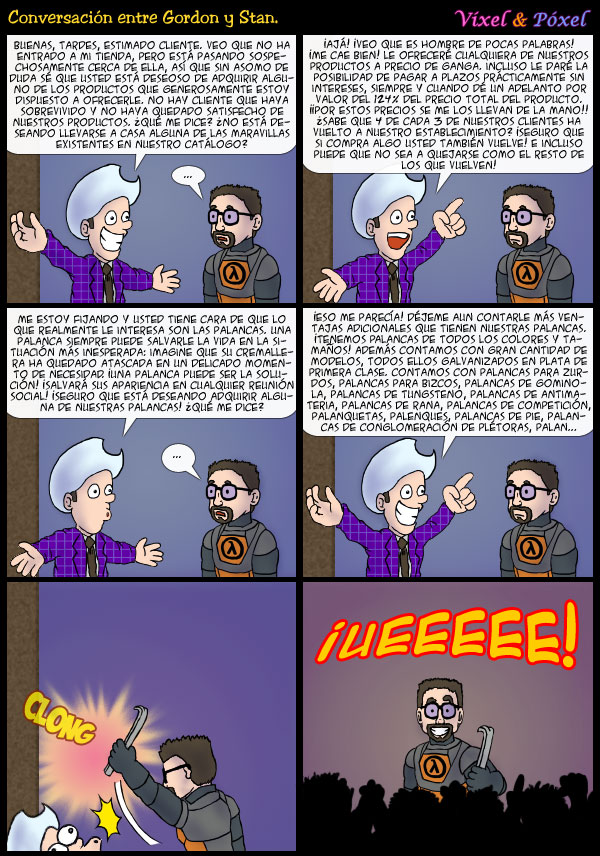 Arcangel Gabriel el heroé de todos xD 2010-01-18 01:13:03 Momar Has hecho realidad el sueño de muchos jugones. XD 2010-01-18 09:15:56 Luna del siglo Casi disfruté tanto la tira como cuando encerré en un ataúd al "bueno" de Stan XD 2010-07-04 20:45:04 TL;DR 2012-03-13 00:57:05 |